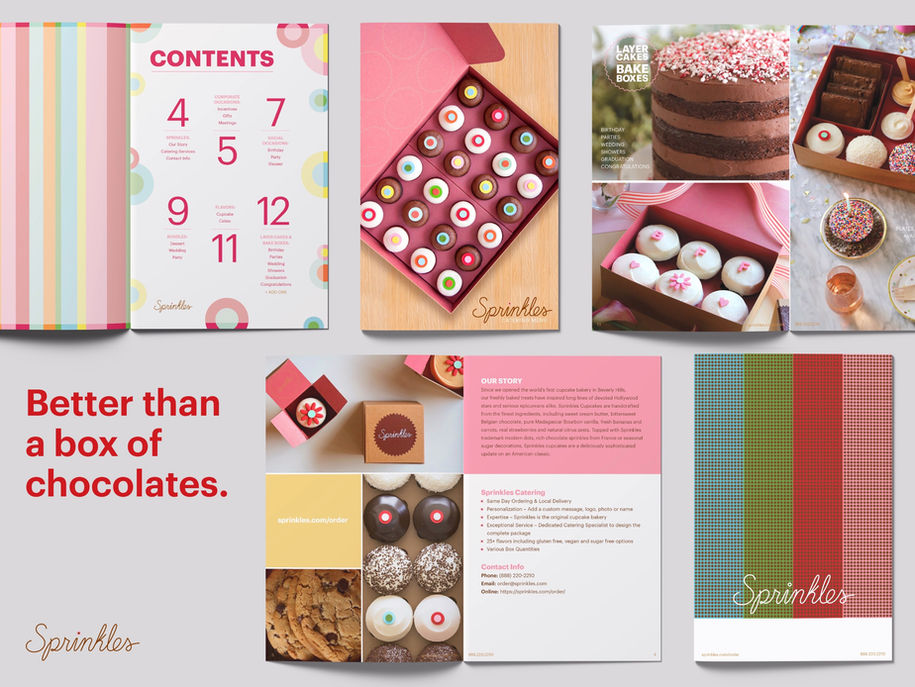 Nothing sweetens your day like a Sprinkles cupcake! Over the years our team has had the pleasure of designing for the Sprinkles brand. By way of catalogs, monthly promotions, cupcake ATM's, social media, packaging, store fronts, menu boards, window clings and more.